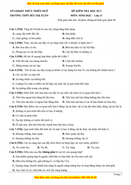 Đề thi học kì 1 Sinh học 11 trường THPT Bùi Thị Xuân - Thừa Thiên Huế