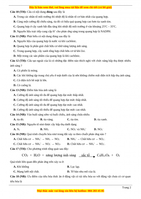 Câu 8 (TH): Các tia sáng nào sau đây kích thích sự tổng hợp các axit amin, prôtêin? A. Tia xanh tím. B. Tia đỏ. C. Tia vàng D. Tia cam.