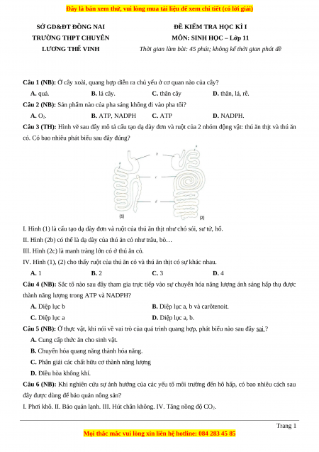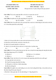 Đề thi học kì 1 Sinh học 11 trường THPT Chuyên Lương Thế Vinh - Đồng Nai
