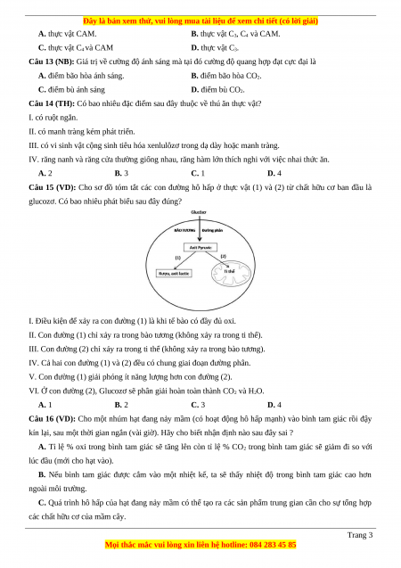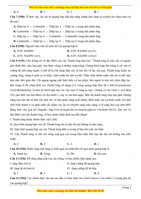 Câu 12 (TH): Các nhóm thực vật nào sau đây có thực hiện chu trình Canvin ( chu trình C3) trong pha tối của quang hợp? Trang 2