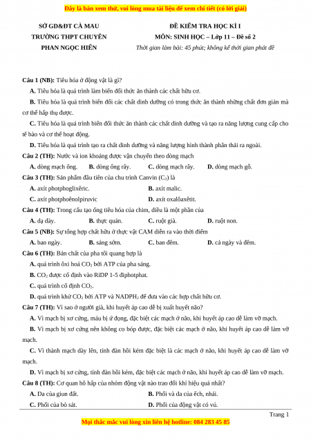MÔN: SINH HỌC – Lớp 11 – Đề số 2 PHAN NGỌC HIỂN