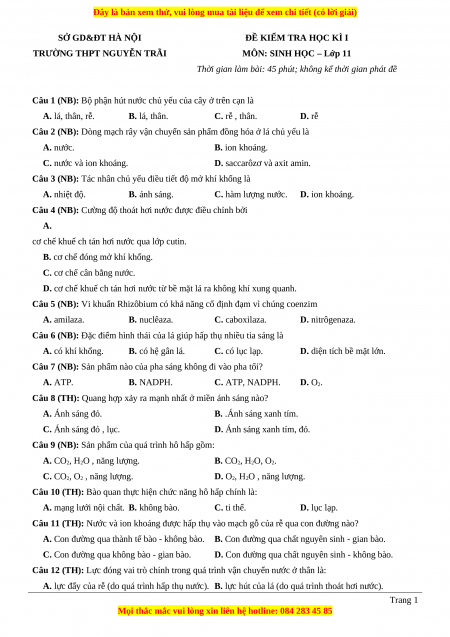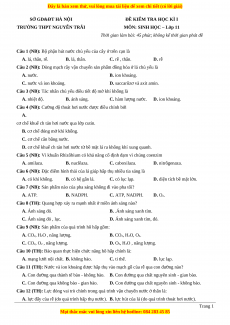 Đề thi học kì 1 Sinh học 11 trường THPT Nguyễn Trãi - Hà Nội