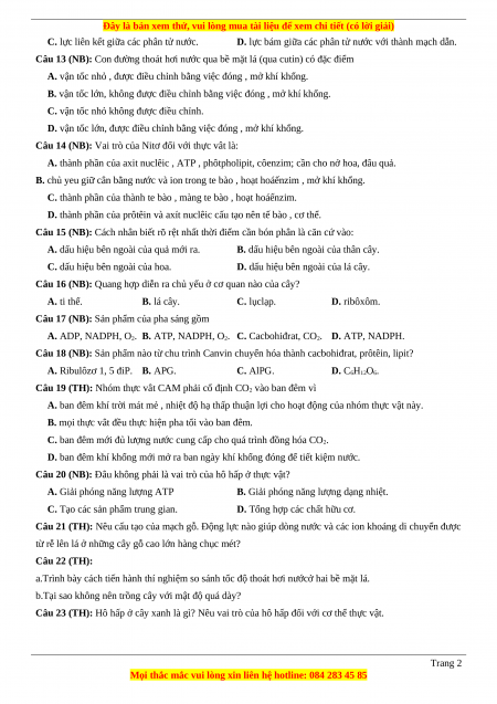 Câu 2 (NB): Dòng mạch rây vận chuyển sản phẩm đồng hóa ở lá chủ yếu là A. nước. B. ion khoáng.