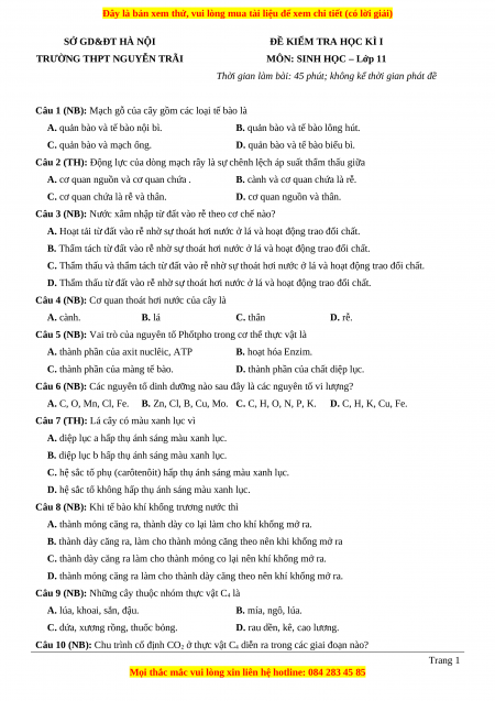 Đề thi học kì 1 Sinh học 11 trường THPT Nguyễn Trãi - Hà Nội
