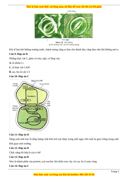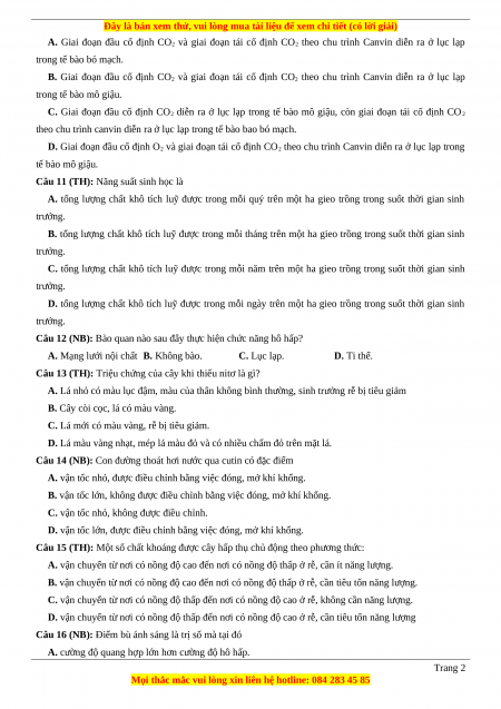Câu 10 (NB): Chu trình cố định CO2 ở thực vật C4 diễn ra trong các giai đoạn nào? Trang 1