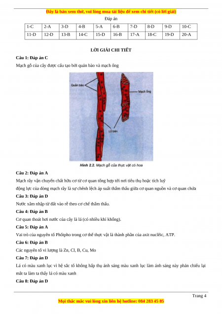 Câu 1 (NB): Mạch gỗ của cây gồm các loại tế bào là