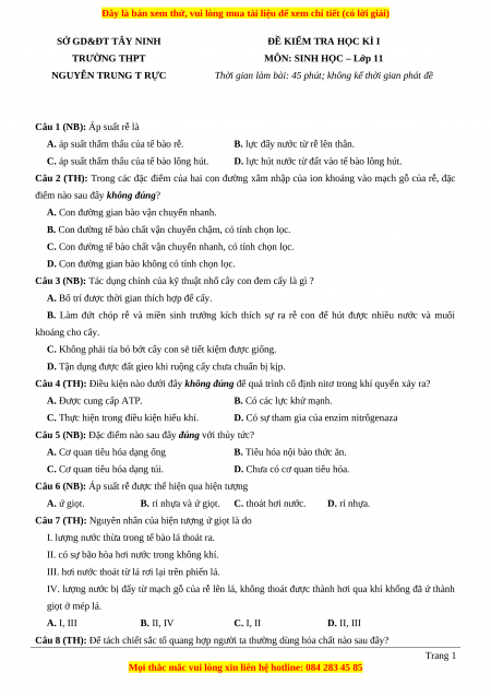 Đề thi học kì 1 Sinh học 11 trường THPT Nguyễn Trung Trực - Tây Ninh