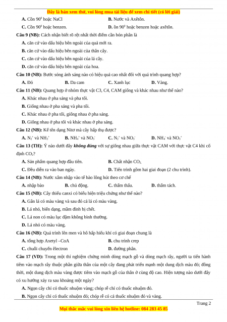 Câu 8 (TH): Để tách chiết sắc tố quang hợp người ta thường dùng hóa chất nào sau đây? Trang 1
