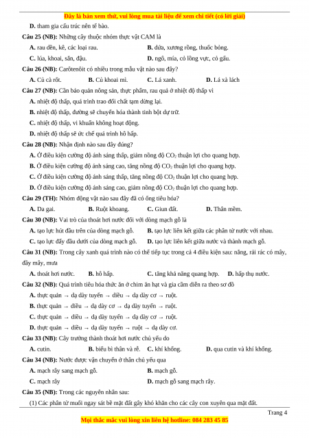 Câu 26 (NB): Carôtenôit có nhiều trong mẫu vật nào sau đây? A. Củ cà rốt. B. Củ khoai mì. C. Lá xanh. D. Lá xà lách