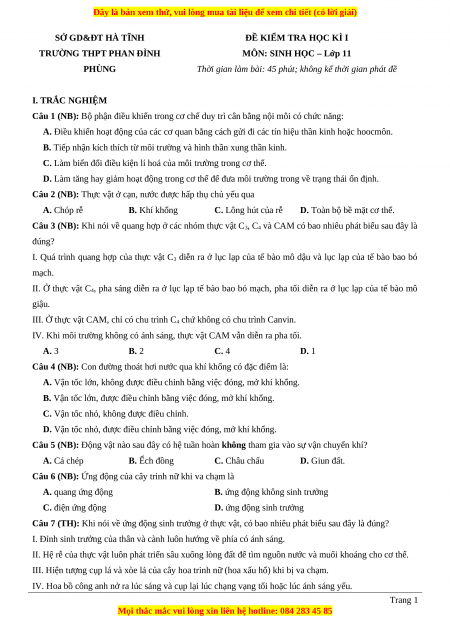 Đề thi học kì 1 Sinh học 11 trường THPT Phan Đình Phùng - Hà Tĩnh