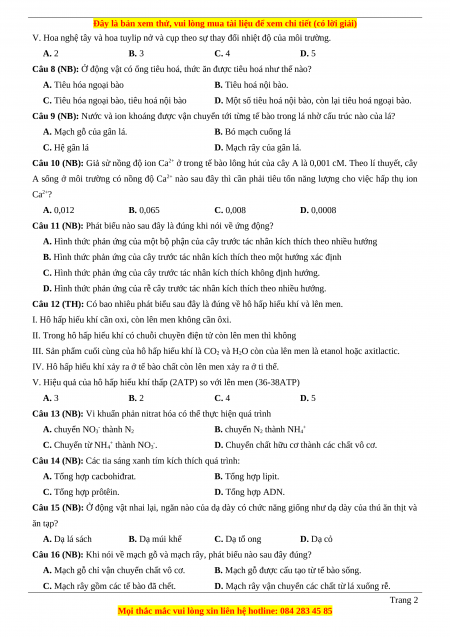Câu 2 (NB): Thực vật ở cạn, nước được hấp thụ chủ yếu qua A. Chóp rễ B. Khí khổng