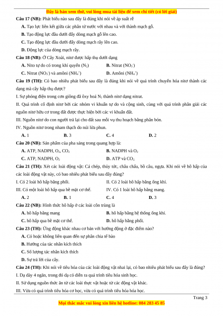 Câu 18 (NB): Ở Cây Xoài, nitơ được hấp thụ dưới dạng