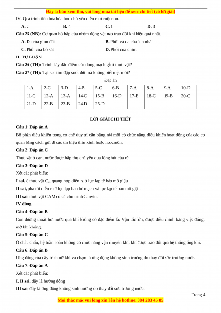 Câu 27 (TH): Tại sao tim đập suốt đời mà không biết mệt mỏi? Đáp án 1-A 2-C 3-D 4-B 5-C 6-B 7-A 8-A 9-A 10-D 11-C 12-A 13-A 14-C 15-B 16-D 17-B 18-C 19-B 20-C 21-D 22-B 23-B 24-D 25-D LỜI GIẢI CHI TIẾT