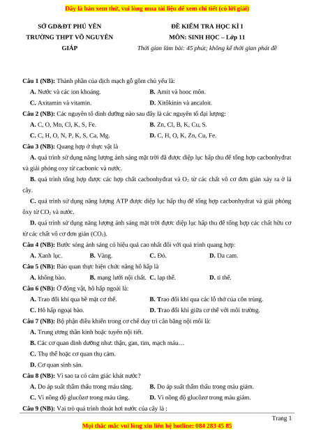Đề thi học kì 1 Sinh học 11 trường THPT Võ Nguyên Giáp - Phú Yên