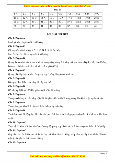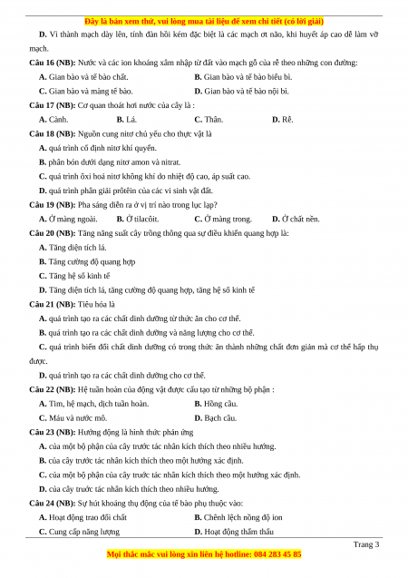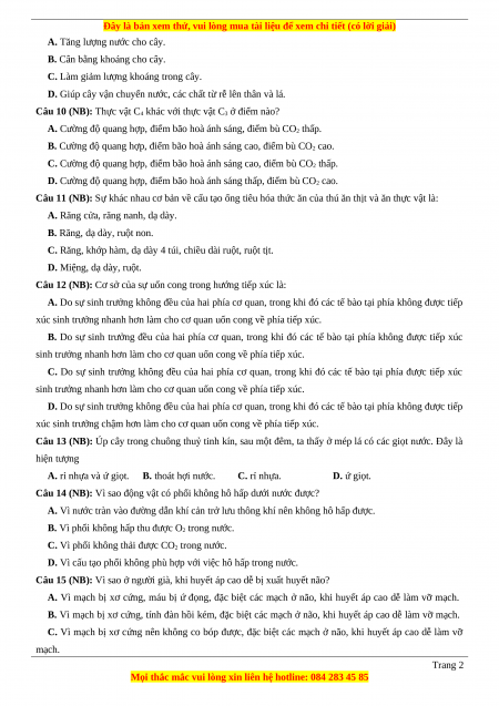 Câu 9 (NB): Vai trò quá trình thoát hơi nước của cây là : Trang 1