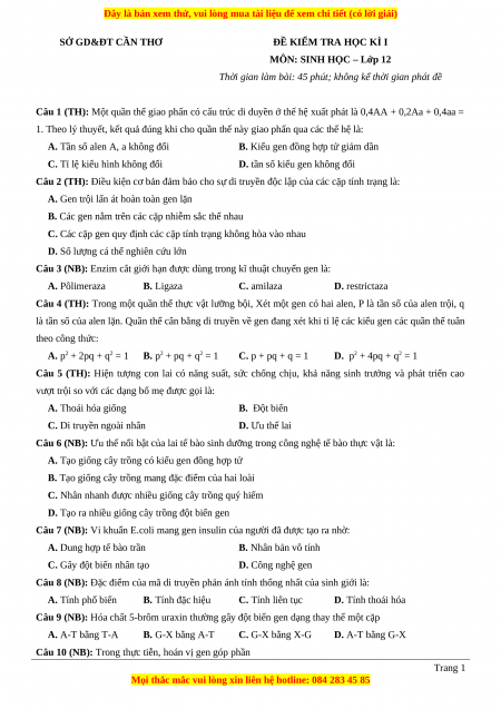 Đề thi học kì 1 Sinh học 12 năm 2023 Sở GD_ĐT Cần Thơ