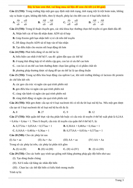 Câu 22 (TH): Trong trường hộp một gen quy định một tính trạng, tính trạng trội là trội hoàn toàn, không