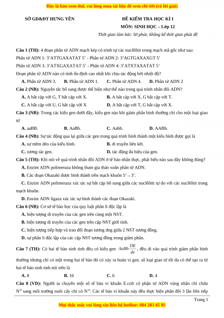 Đề thi học kì 1 Sinh học 12 năm 2023 Sở GD_ĐT Hưng Yên