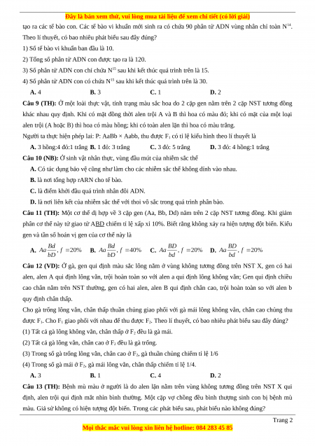 màu. Giả sử không có hiện tượng đột biến. Trong các phát biểu sau, phát biểu nào không đúng? Trang 2