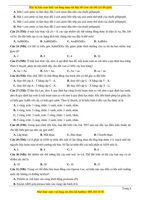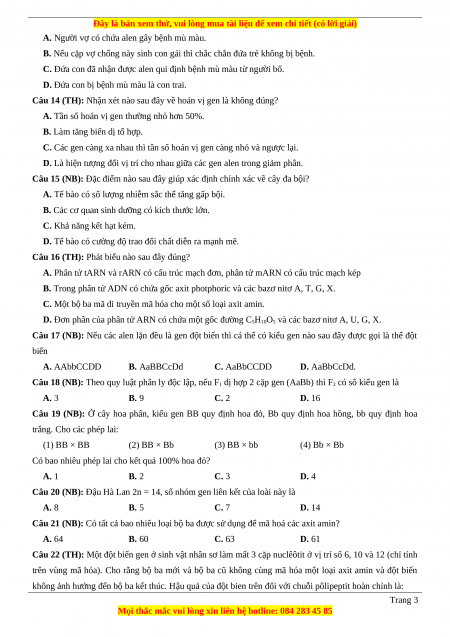 Câu 21 (NB): Có tất cả bao nhiêu loại bộ ba được sử dụng để mã hoá các axit amin? A. 64 B. 60 C. 63 D. 61