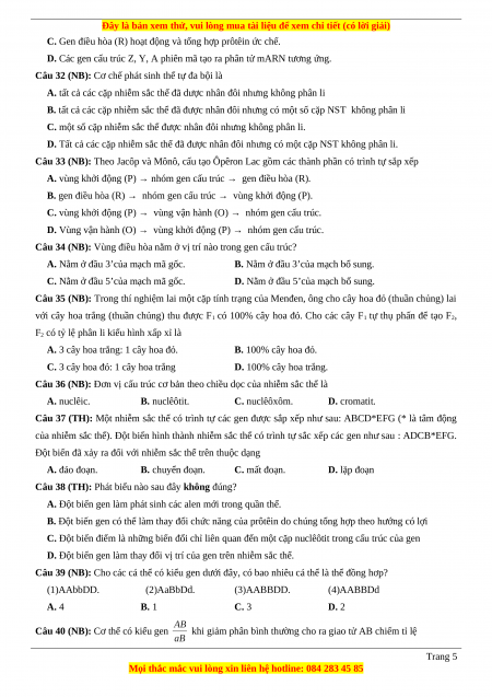 Câu 17 (NB): Nếu các alen lặn đều là gen đột biến thì cá thể có kiểu gen nào sau đây được gọi là thể đột biến A. AAbbCCDD B. AaBBCcDd C. AaBbCCDD D. AaBbCcDd.