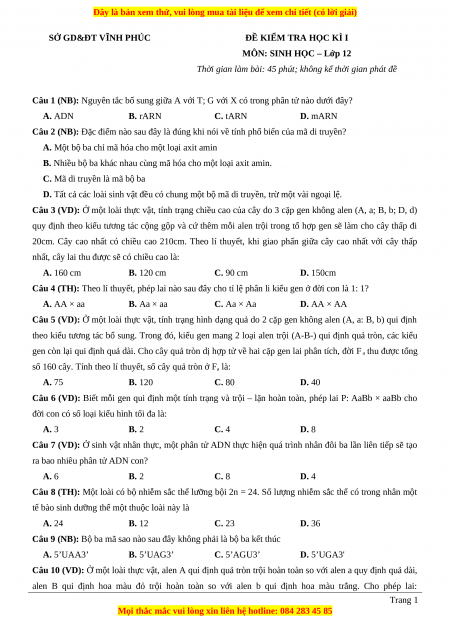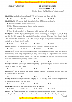 Đề thi học kì 1 Sinh học 12 năm 2023 Sở GD_ĐT Vĩnh Phúc