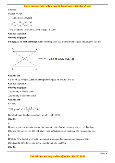 Tỷ lệ kiểu hình: 1 tròn, đỏ : 2 tròn, trắng : 1 dài, đỏ Câu 11: Đáp án B Phương pháp giải: