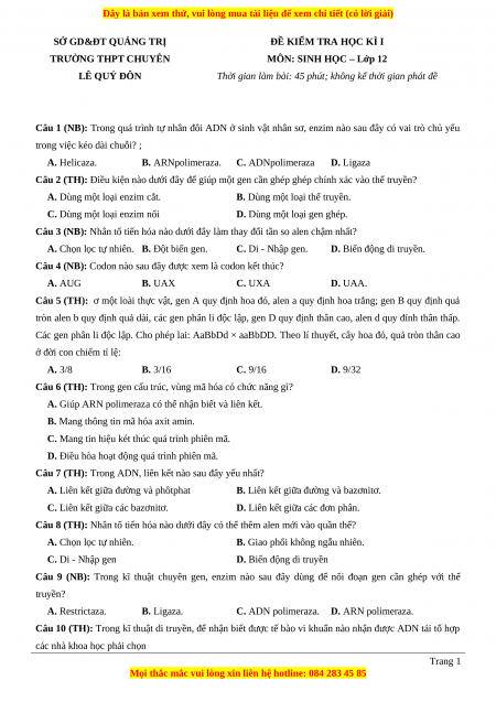 Đề thi học kì 1 Sinh học 12 năm 2023 trường THPT Chuyên Lê Qúy Đôn - Quảng Trị