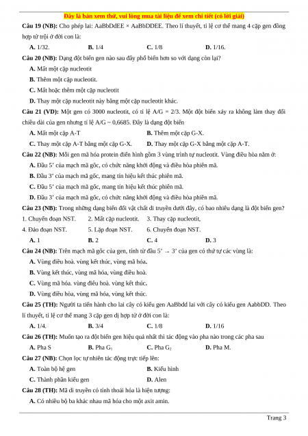 Câu 21 (VD): Một gen có 3000 nucleotit, có tỉ lệ A/G = 2/3. Một đột biến xảy ra không làm thay đổi