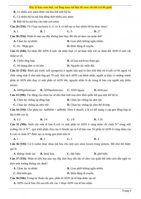 Câu 29 (TH): Từ 3 loại nucleotit U, G và X có thể tạo ra bao nhiêu bộ ba khác nhau? A. 1 B. 3 C. 9 D. 27