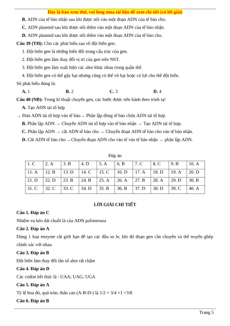 Câu 9 (NB): Trong kĩ thuật chuyên gen, enzim nào sau đây dùng để nối đoạn gen cần ghép với thể truyền? A. Restrictaza. B. Ligaza.