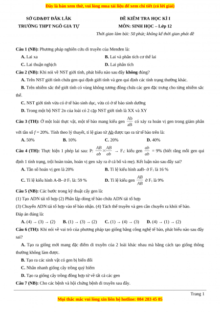 Đề thi học kì 1 Sinh học 12 năm 2023 trường THPT Ngô Gia Tự - Đắk Lắk