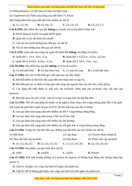 Câu 13 (NB): Trong các loại đột biến sau, những loại đột biến cấu trúc nhiễm sắc thể là: (1) Mất đoạn (2) Lặp đoạn