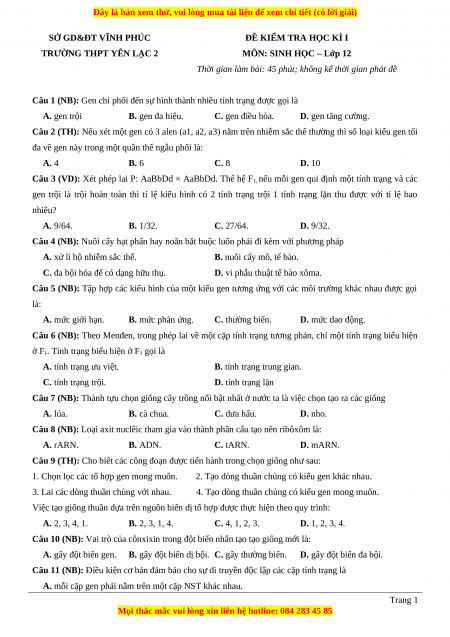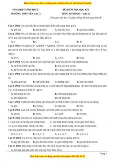 Đề thi học kì 1 Sinh học 12 năm 2023 trường THPT Yên Lạc 2 - Vĩnh Phúc