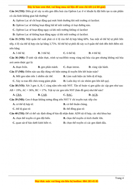 Câu 37 (NB): Điểm nào sau đây đúng với hiện tượng di truyền liên kết hoàn toàn?