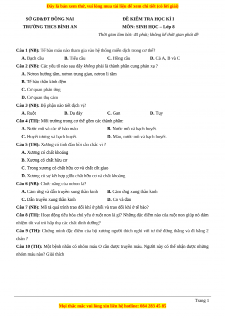 Đề thi học kì 1 Sinh học 8 năm 2023 trường THCS Bình An - Đồng Nai