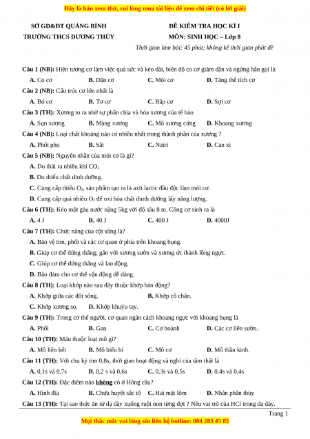 Đề thi học kì 1 Sinh học 8 năm 2023 trường THCS Dương Thuỷ - Quảng Bình