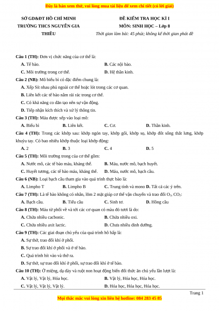 +Đề thi học kì 1 Sinh học năm 2023 trường THCS Nguyễn Gia Thiều - TP HCM;