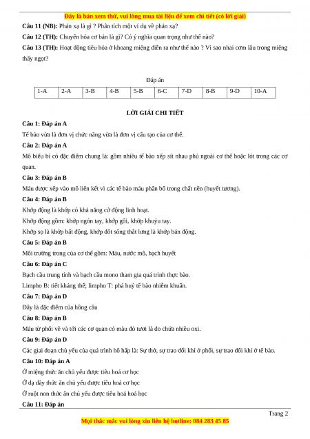 Câu 13 (TH): Hoạt động tiêu hóa ở khoang miệng diễn ra như thế nào ? Vì sao nhai cơm lâu trong miệng thấy ngọt? Đáp án 1-A 2-A 3-B 4-B 5-B 6-C 7-D 8-B 9-D 10-A LỜI GIẢI CHI TIẾT