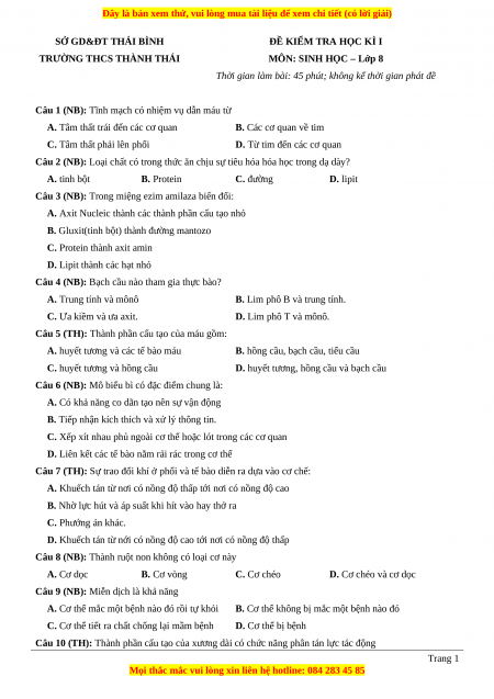 +Đề thi học kì 1 Sinh học năm 2023 trường THCS Thái Thành - Thái Bình.