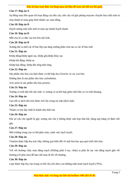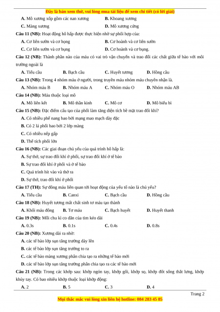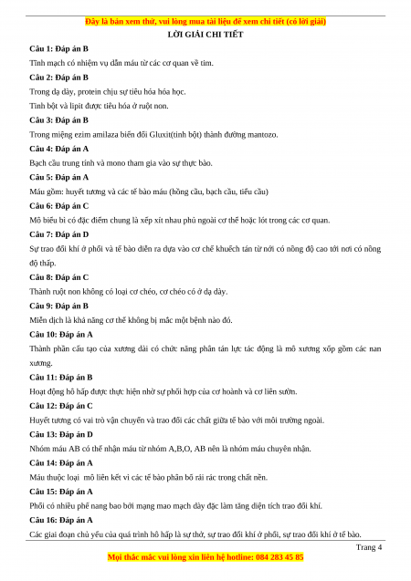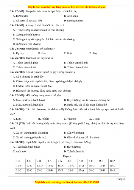 A. Tuần hoàn bạch huyết B. Huyết tương C. nước mô D. Tuần hoàn máu Đáp án 1-B 2-B 3-B 4-A 5-A 6-C 7-D 8-C 9-B 10-A 11-B 12-C 13-D 14-A 15-A 16-A 17-A 18-D 19-D 20-D 21-C 22-C 23-C 24-B 25-B 26-B 27-A 28-C 29-D 30-A Trang 3