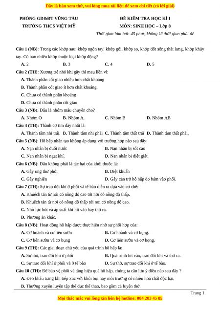 Đề thi học kì 1 Sinh học 8 năm 2023 trường THCS - THPT Việt Mỹ - BR - VT