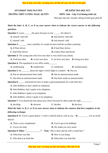Tailieugiaovien.com.vn giới thiệu bộ 21 đề thi học kì 1 môn Tiếng Anh lớp 12 mới nhất năm 2022 - 2023 nhằm giúp Giáo viên có thêm tài liệu tham khảo ra đề thi Tiếng anh lớp 12.