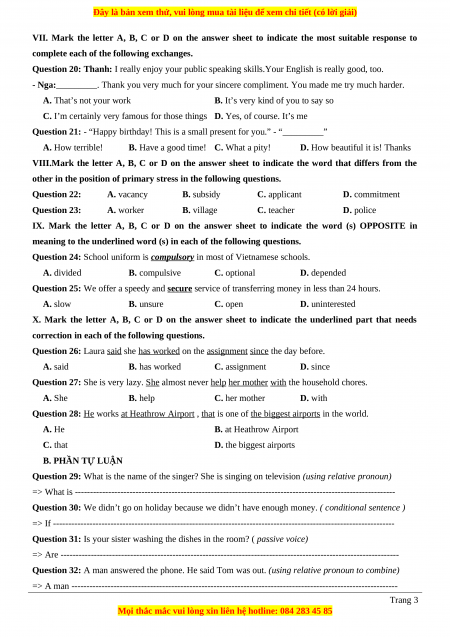 Question 28: He works at Heathrow Airport , that is one of the biggest airports in the world. A. He B. at Heathrow Airport C. that D. the biggest airports B. PHẦN TỰ LUẬN