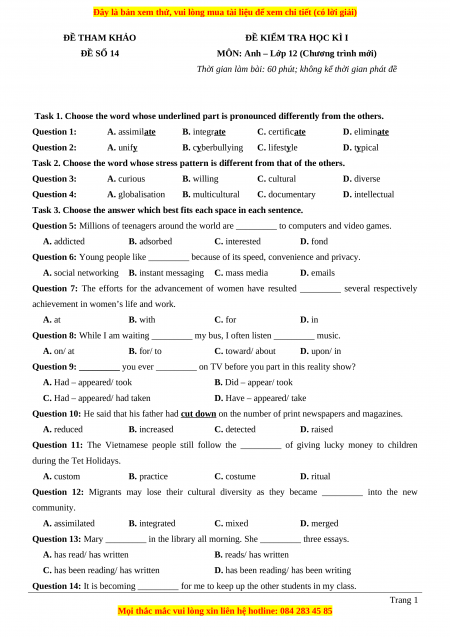 Đề thi học kì 1 Tiếng anh 12 năm 2022 - 2023 (Đề 14)