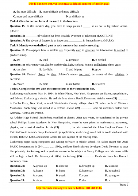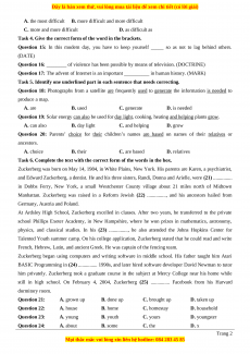 still in high school. On February 4, 2004, Zuckerberg (25) ............... Facebook from his Harvard dormitory room. Question 21: A. grown up B. done up C. brought up D. taken up Question 22: A. house B. home C. homestay D. household Question 23: A. young B. youth C. yours D. youngster Question 24: A. about B. some C. the D. x Trang 2