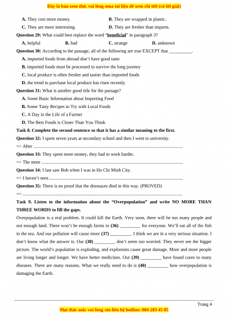 diseases. There are many reasons. What we really need to do is (40) _________ how overpopulation is damaging the Earth. Trang 4
