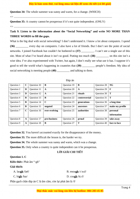 social networking is meeting people (40) _________ and talking to them. Đáp án Question 1 C Question 10 B Question 19 B Question 28 NG Question 2 D Question 11 A Question 20 A Question 29 F Question 3 D Question 12 A Question 21 rituals Question 30 T Question 4 B Question 13 B Question 22 controversial Question 31 T Question 5 B Question 14 C Question 23 generations Question 36 a long time Question 6 B Question 15 negated Question 24 ancestors Question 37 make my profile Question 7 C Question 16 ever-evolving Question 25 authorities Question 38 personal information Question 8 A Question 17 pro-business Question 26 proud Question 39 take away Question 9 A Question 18 B Question 27 T Question 40 face to face