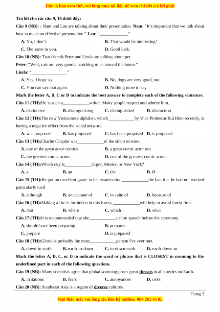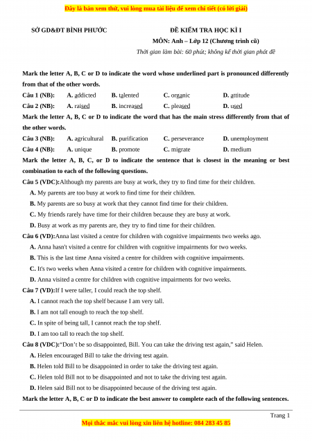 Mark the letter A, B, C or D to indicate the best answer to complete each of the following sentences. Trang 1