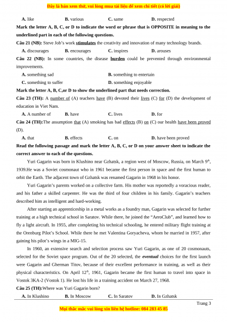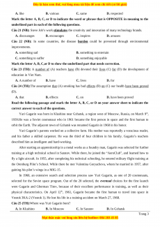 Câu 25 (TH):Where was Yuri Gagarin born? A. In Klushino B. In Moscow C. In Saratov D. In Gzhatsk Trang 3